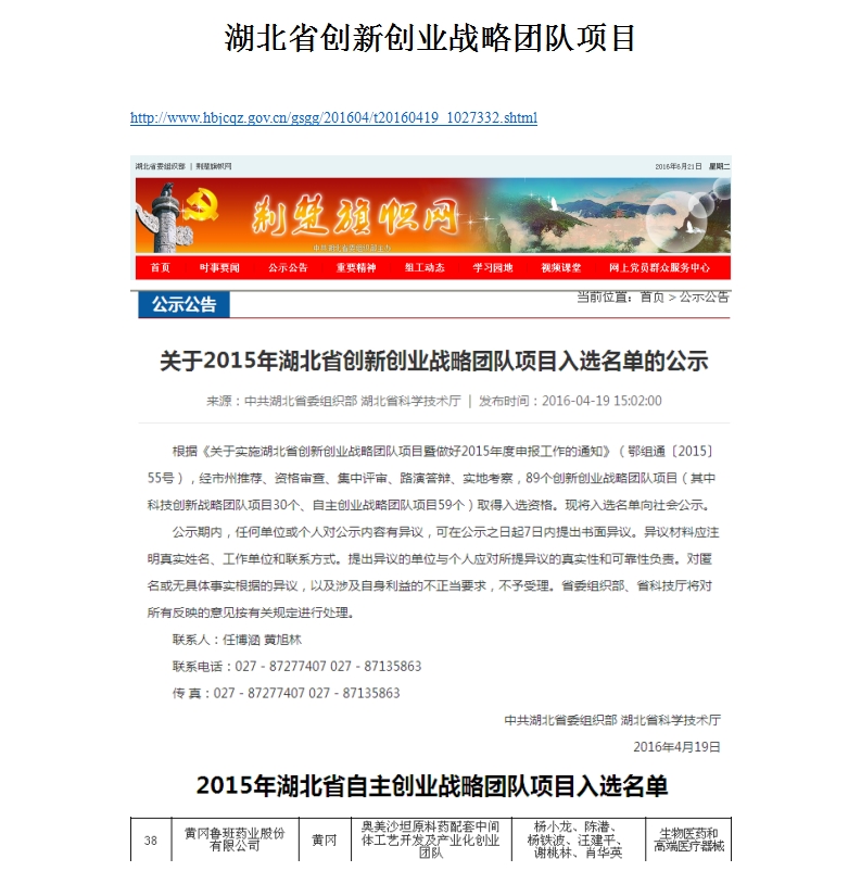 2016年4月,公司奧美沙坦原料藥配套中間體工藝開發(fā)及產(chǎn)業(yè)化項(xiàng)目成功入選2015年湖北省自主創(chuàng)業(yè)戰(zhàn)略團(tuán)隊項(xiàng)目名單,可獲得政府創(chuàng)業(yè)資金扶持。
